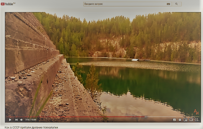 Screenshot (10)Ну а теперь привет из Сибири...Эх,жил там когда-то...Ну и ладно.Теперь скрин с сервиса Youtube  и здесь я наблюдаю очень интересную картину - не помню,но это находится точно в Сибири,точное место и красиво очень-холмистый берег,заросший лесом,водная гладь и ещё второй берег-но этот берег не совсем берег,это просто лестница с огромными ступенями,которые уходят в воду,как я понял,и эти ступени слишком ровные для природного образования,эти ступени явно вырублены в скальном массиве и очень ровно так,но разные по высоте и ширине-видимо тренировался кто-то...Конечно это сделано не просто так,ничего просто так не делается,особенно в глухой тайге в скальном массиве...В Сибири вообще очень много интересного,хотя бы то что практически вся тайга поделена ровнейшими просеками на