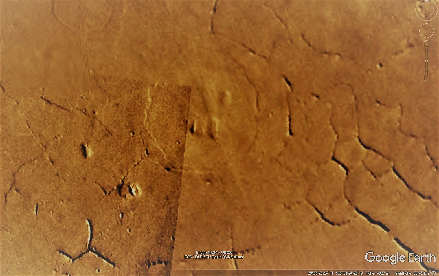 Луна-Луной,а по Марсу тоже как-то всё непонятные скриншоты.Но,благодаря нашему уважаемому Google и его сервису GoogleEarth можно получше рассмотреть поверхность Марса.В принципе ничего особенного,тем более это "ничего"придаёт виртуальным исследователям столько много виртуальных сил для поисков чего-нибудь особенного.Самое главное - к рассмотрению особенного и неособенного,смотреть в оба глаза.Ниже будут скрины,может и не качественные,но с помощью фильтров вроде получилось получше.Рассказывать-что там можно увидеть,смысла просто нет.И в любом случае каждый увидит то что увидит сам.Немного напоминает структуру спила дерева,но не это главное.Скриншоты снизу,немного перехимичил,но...
